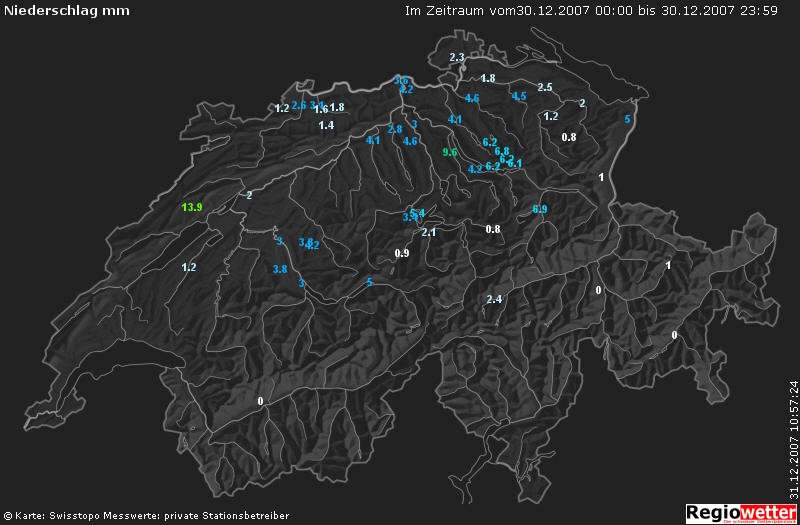 Wenigstens hat GFS die Niederschlagsmengen und -verteilung gut im Griff gehabt: wie im Thread geschrieben, konnten 2 bis 10 mm (je nach Region) erwartet werden. Der Schwerpunkt lag eher in den zentralen und östlichen Voralpen, was auch eingetroffen ist. Folgende Niederschlagsmengen wurden aufgezeichnet: