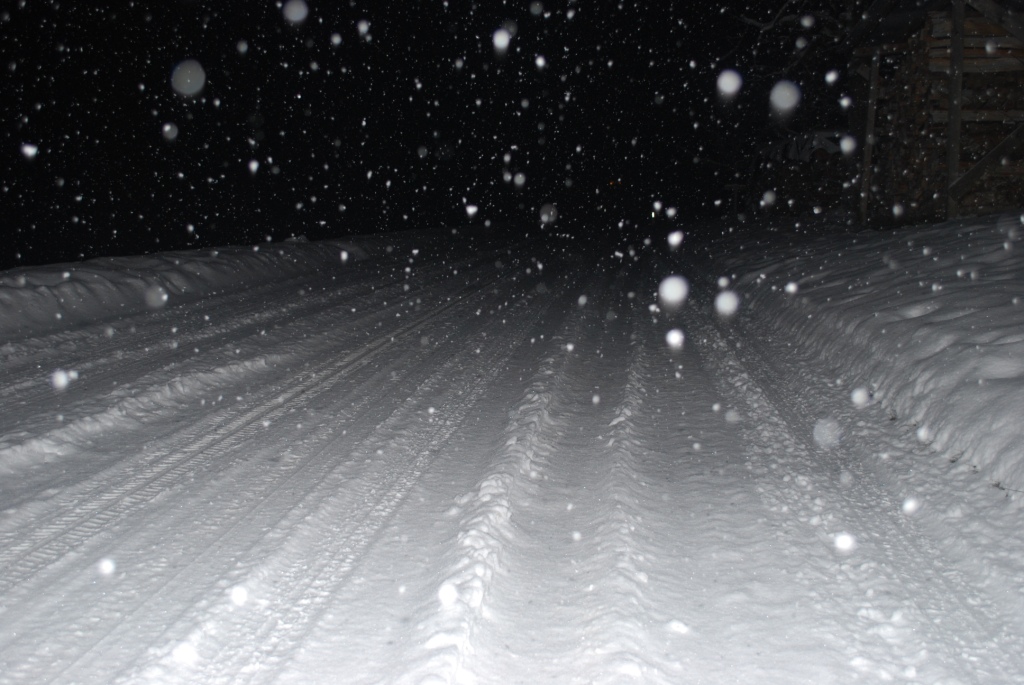 Hier liegen jetzt ungefähr 3 cm Schnee und es schneit ganz ganz leicht weiter.
