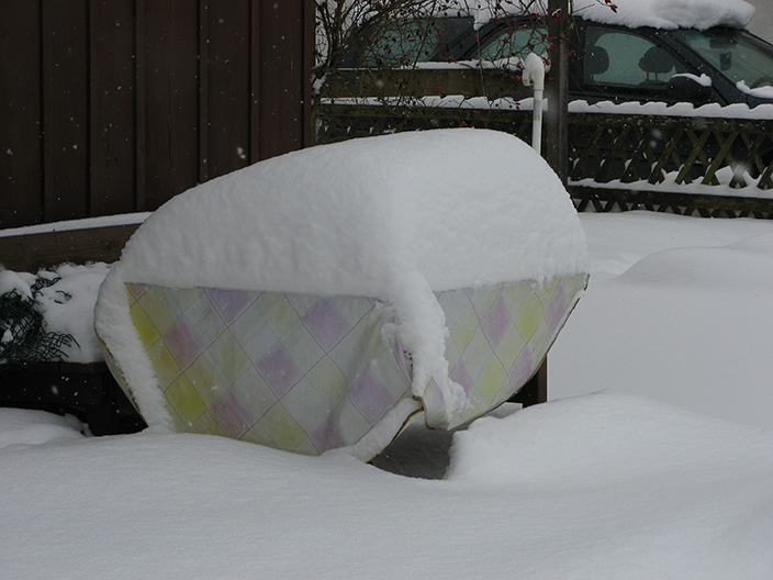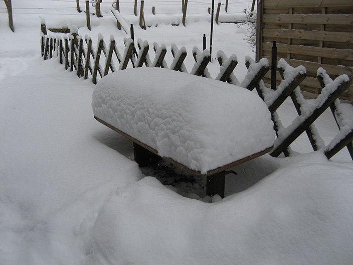 Tisch (halb unter dem Dach) und Bank besetzt vom Schnee: