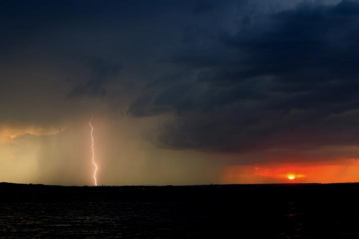 Im Bild links ein Blitz, rechts unten die untergehende Sonne