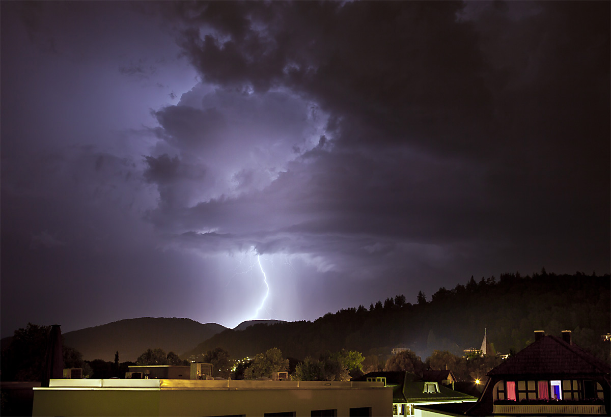 Die kleine Jurazelle, zog nördlich an Aarau vorbei und ich konnte sie von zu Hause aus gut beobachten. Viele Blitze waren wie so oft in den Wolken. Einpaar Wenige "verirrten" sich auf meine Aufnhamen.