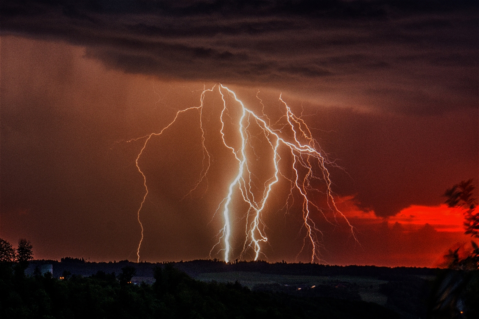 Kurz vor diesem Treffer schaute ich das Abendrot an. Auf dem Radar war gerade eine Neubildung auszumachen. Ich dachte, "da würde sich ein Blitz gut machen", da sauste ein weisses Spinnennetz aus der Wolke in alle Richtungen - genial. Ein Bild, das lange im Kopf haften bleibt.Ein Glückstreffer mit einer alten Kamera, mehr dazu später...