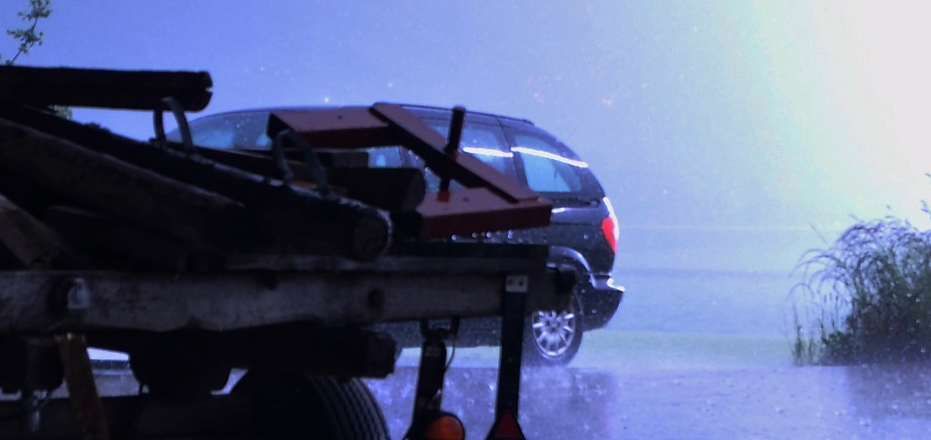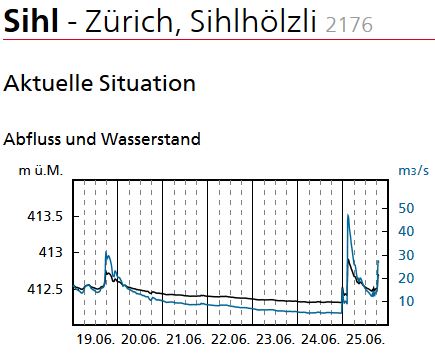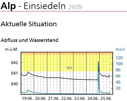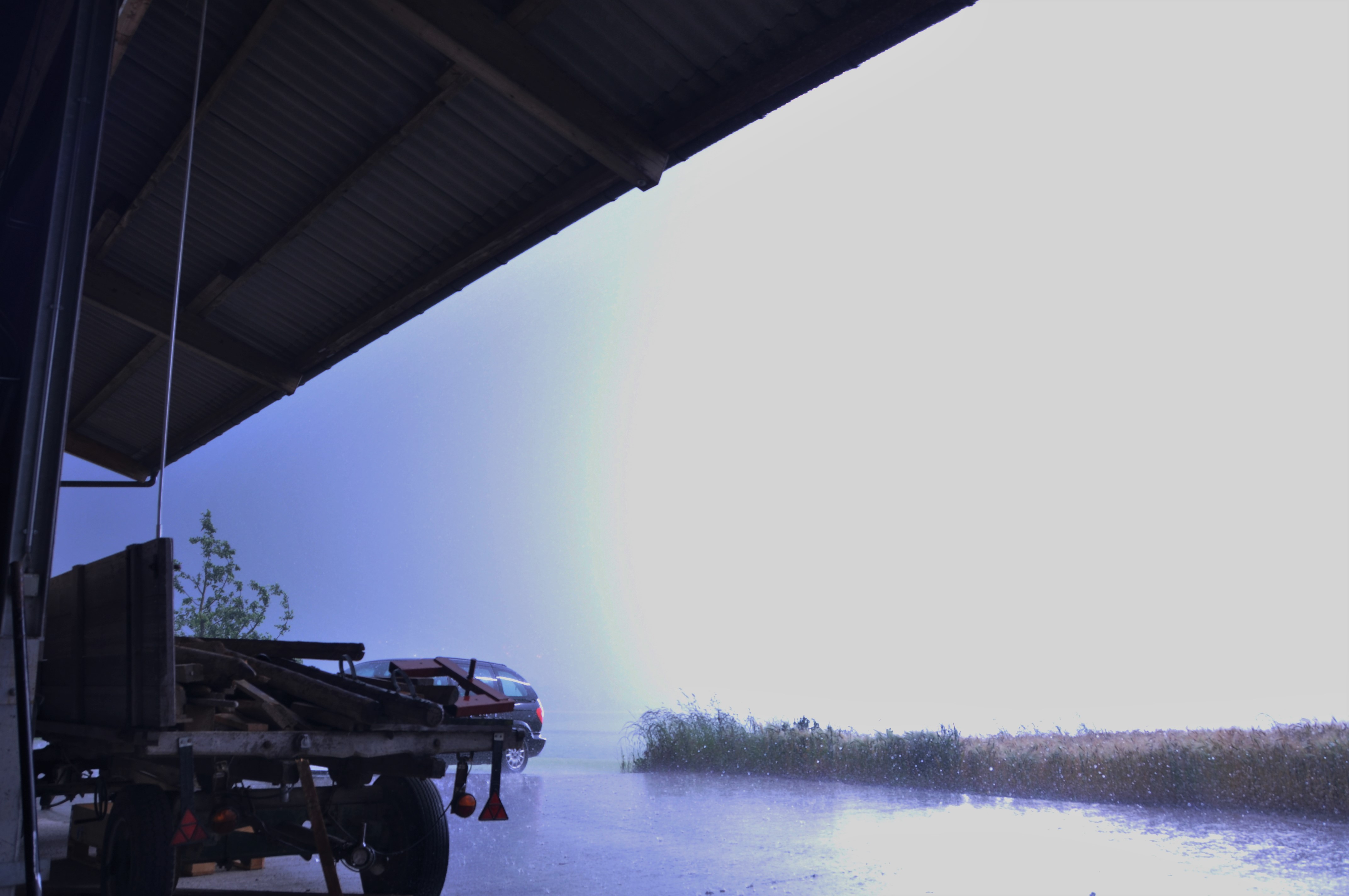 Nachdem der Regen etwas nachgelassen hatte, entschieden wir uns bei Geisingen die Autobahn zu verlassen. Zuerst mussten wir noch die Ausfahrt suchen, da die Sicht so schlecht war und die Markierungen in Deutschland (meinte ich) nicht reflektieren. Unter der Autobahnbrücke standen Autos mit Pannenblinker und wir dachten an Hochwasser. Es war wohl die Angst vor dem Hagel, der allerdings nicht aufgetreten ist. Auf der Rückfahrt durchqerten wir nochmals das Starkregengebiet, dass mittlerweile schwächer wurde. Wegen der besseren Sicht sahen wir einige Kilometer vor uns einen Blitzkanal bis an den Boden. Kurz später fiel uns eine Rauchfahne aus einem Waldstück unmittelbar neben der Autobahn auf. Könnte ein Blitzeinschlag gewesen sein, ich denke nicht, dass jemand bei dem Wetter eine Grillparty organisiert.