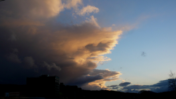 Die letzten zwei Bilder wurden bei Brugg aufgenommen um 18.20 Uhr. Die Abendsonne beleuchtet den Hut eines Cumulonimbus und lässt ihn wie einen Eierschwamm erscheinen (letztes Bild).