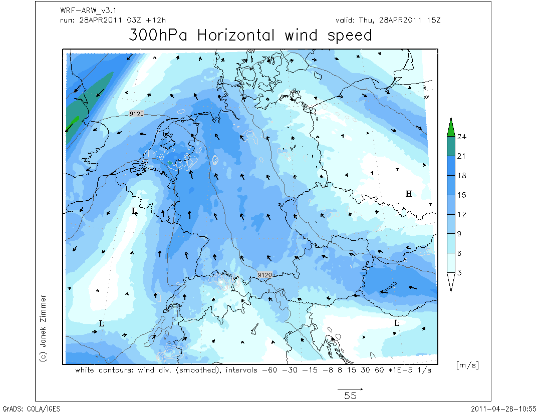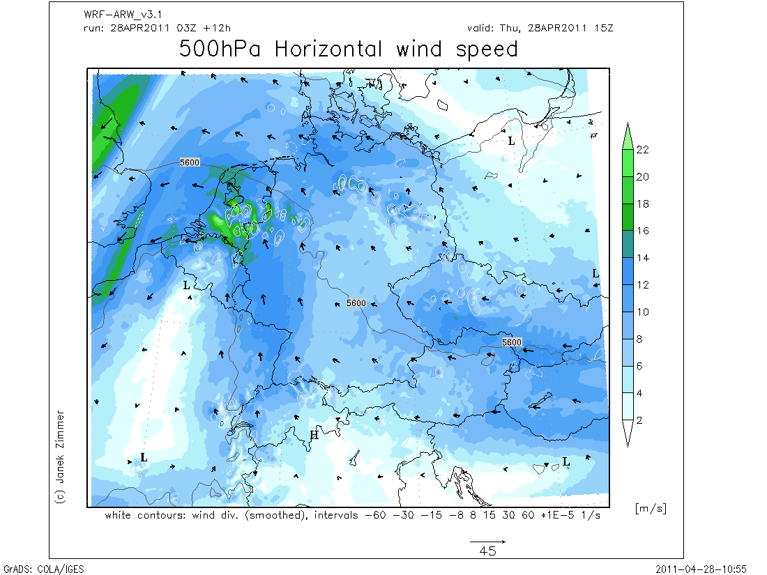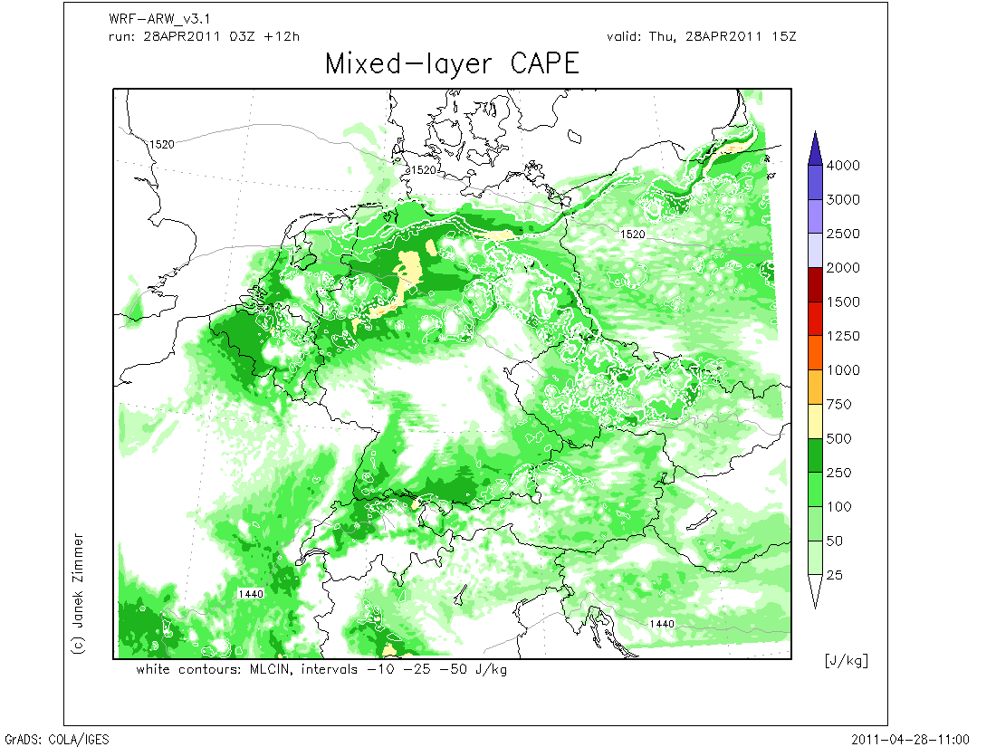 WRF rechnet in der nordöstlichsten Ecke der Schweiz mit CAPE zwischen 500 und 750 J/kg, ausserdem schwenkt wie bereits angesprochen ein Bodentief aus Westösterreich herein: