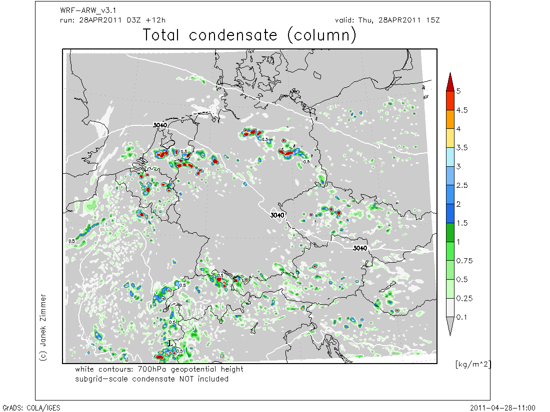 Interessant: Im Gegensatz zu WRF und GSF rechnet Cosmo2 mit nur geringer konvektiver Aktivität in besagtem Raum.