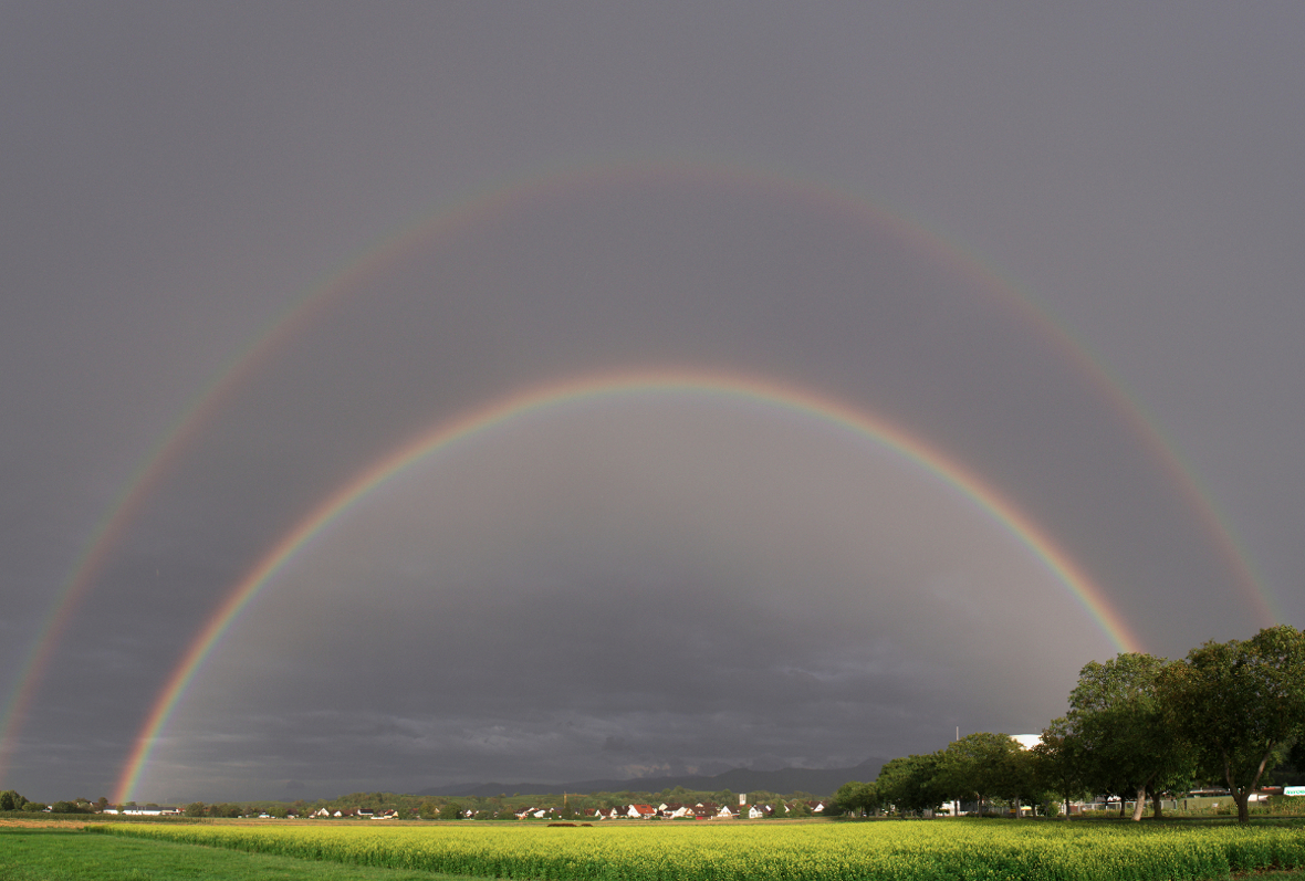 kleiner Nachtrag zum Sonntag letzter Woche. Hatte mich frühzeitig mit Thies getroffen und wir postierten uns südl. von Schliengen im Rheingraben. Letztendlich warteten wir vergeblich auf eine kräftige Zelle am Südende des Zellverbundes über Frankreich, die bereits am frühen Nachmittag weit westlich von Genf unterwegs war. Im Vorfeld entwickelten sich immer wieder Schauer, die aber noch nicht in der Grundschicht Fuss fassen konnten. Schliesslich sollte unsere Zelle zwischen Jura und Vogesen auftauchen - was sie auch schaffte. Doch leider hauchte sie kurz vor erreichen des Rheingrabens ihr Leben aus und ging kaputt. Das Chasing passte irgendwie ins Muster der Saison 2011 und wir fuhren mit fast leeren Händen heimwärts. Wir erwischten kurz vor Schluss noch einen hübschen doppelten Regenbogen, was dann auch der optische Hingucker des Tages war. Später am Abend zog überraschenderweise eine konvektive Linie in den Rheingraben, an deren Nordende auch etwas Elektrizität vorhanden war...habe immerhin noch drei brauchbare Blitzbilder der recht weit entfernten Zelle machen können. :unschuldig: