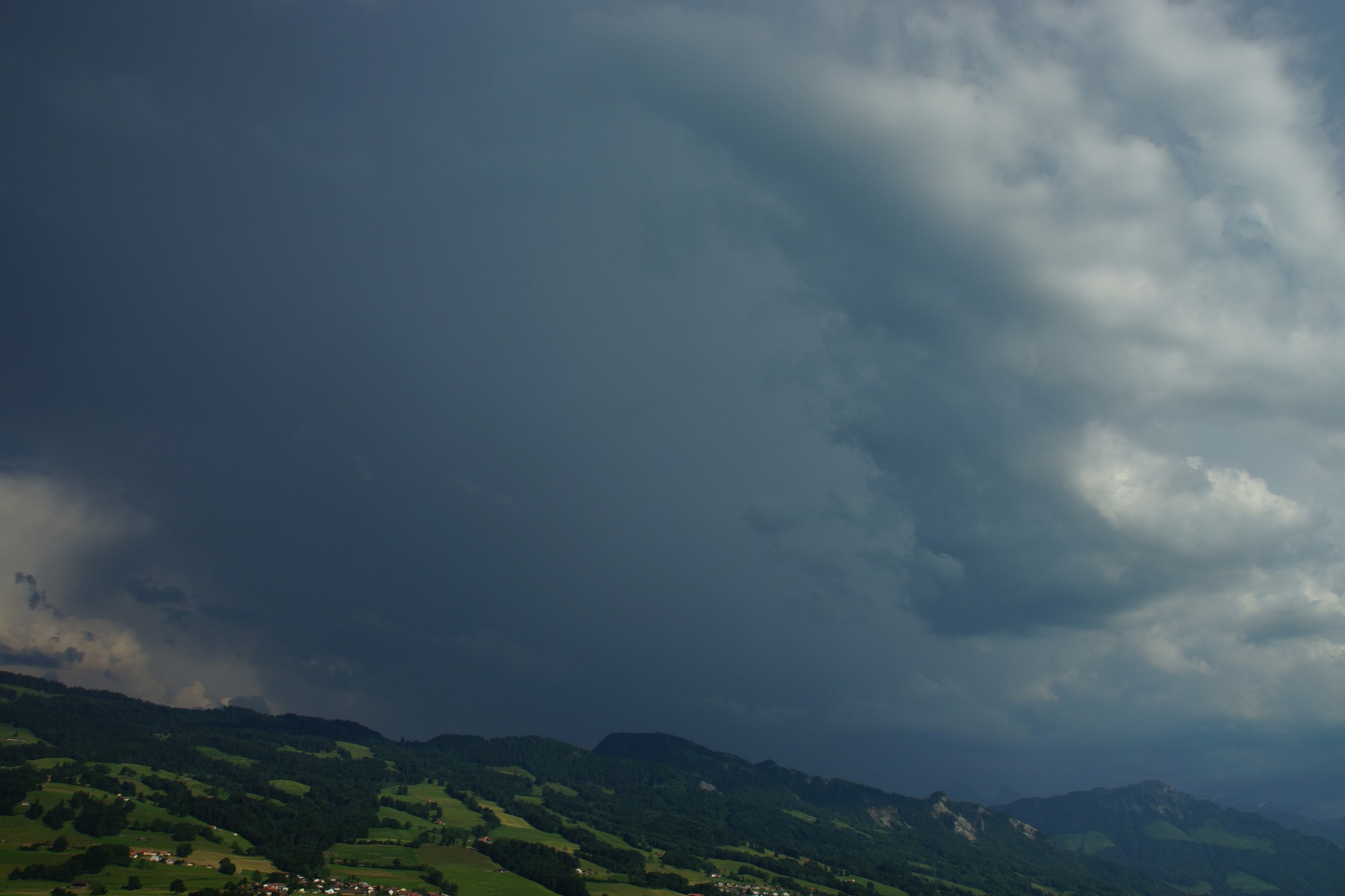 1730 Uhr: Schwarzenegg - dunkle Wolken und Dauergrollen. Die Sicht ist noch gut, Niederschlag fällt kaum, was sich jedoch bald ändern sollte.