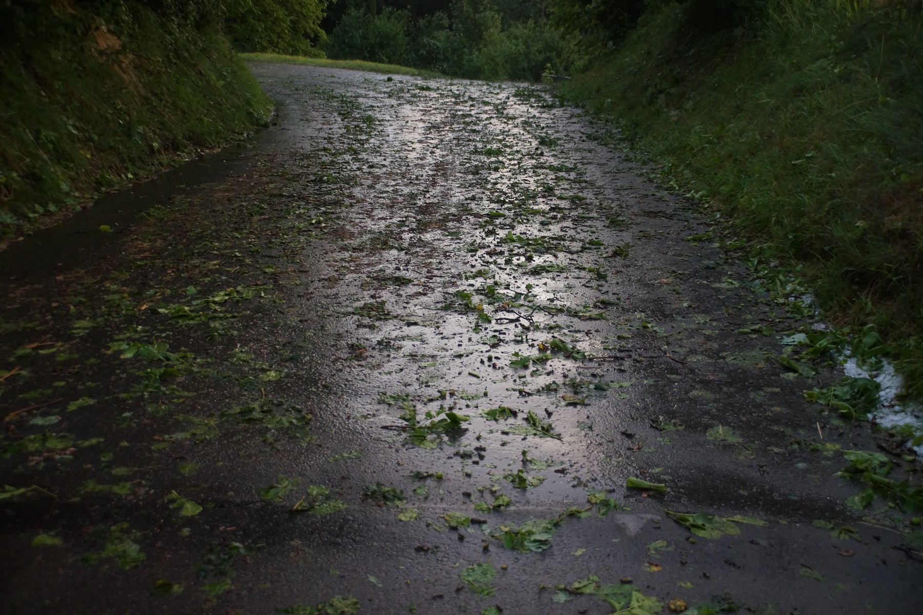 1910 Uhr: Mühleturnen - Hagelkörner mit 5cm Durchmesser fliegen durch die Luft. Es ist das erste Mal dass ich miterlebe wie Hagelkörner wieder bis 2m vom Boden wieder raufspringen. Die Hagelkörner schiessen also nicht nur von oben, sondern wegen den Sturmböen auch vor Seite und mit dem Aufspringen von unten durch die Luft. Ich stehe geschützt bei einer Scheune. Leider konnte ich das Auto dort nicht parkieren und es steht ungeschützt daneben. Als ich die ersten grossen Hagekörner fallen sehe ist es mir zu gefährlich zurück zum Auto zu gehen. Da das Auto in Windrichtung steht zerschlägt es mir zu Glück weder Heck- noch Seitenscheibe wie bei anderen Autos.