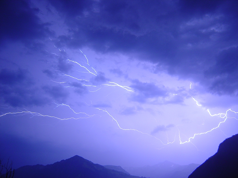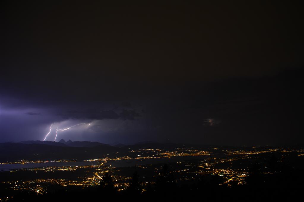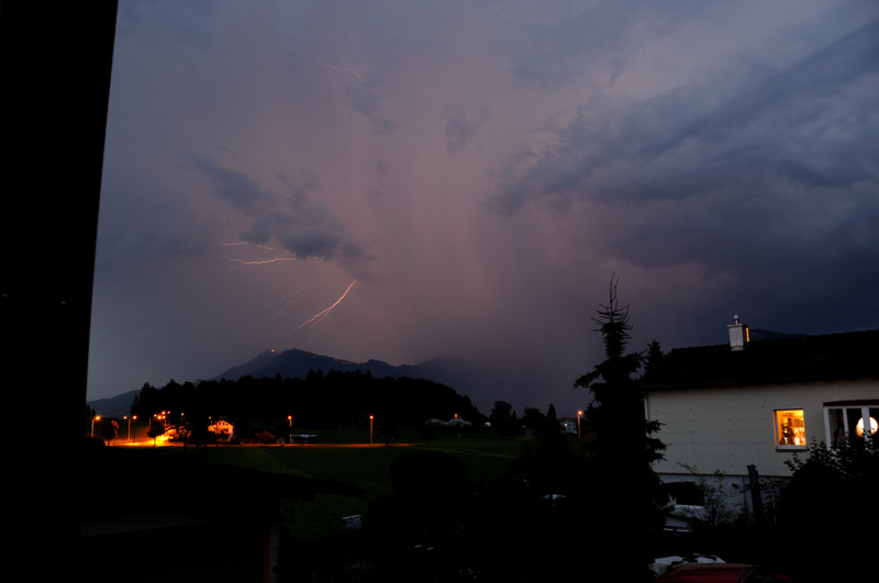 Diese Zelle blitzte hier besonders hell. Aber in den letzten Minuten, wo ich draussen war, haben auch die Zellen um Bern ihre Blitzfrequenz deutlich gesteigert - auf zuletzt gut 1Blitz / 2S, die meisten allerdings Wolkenblitze.