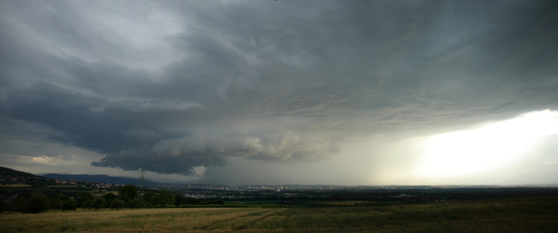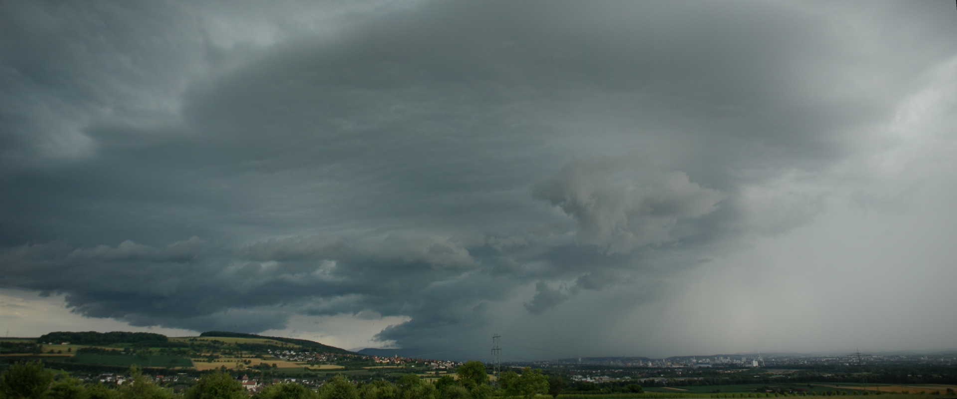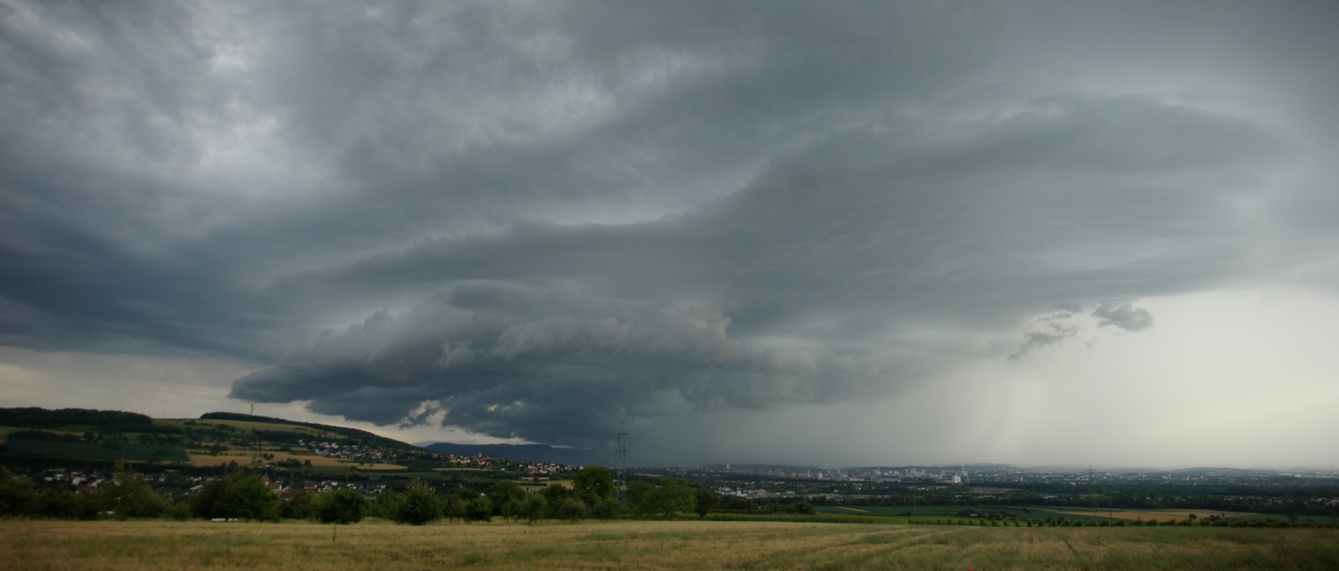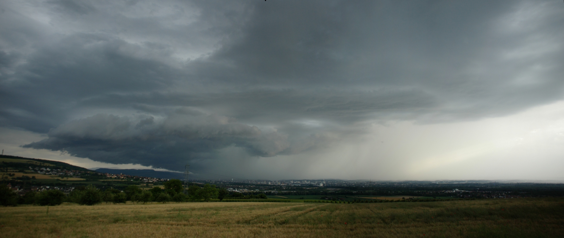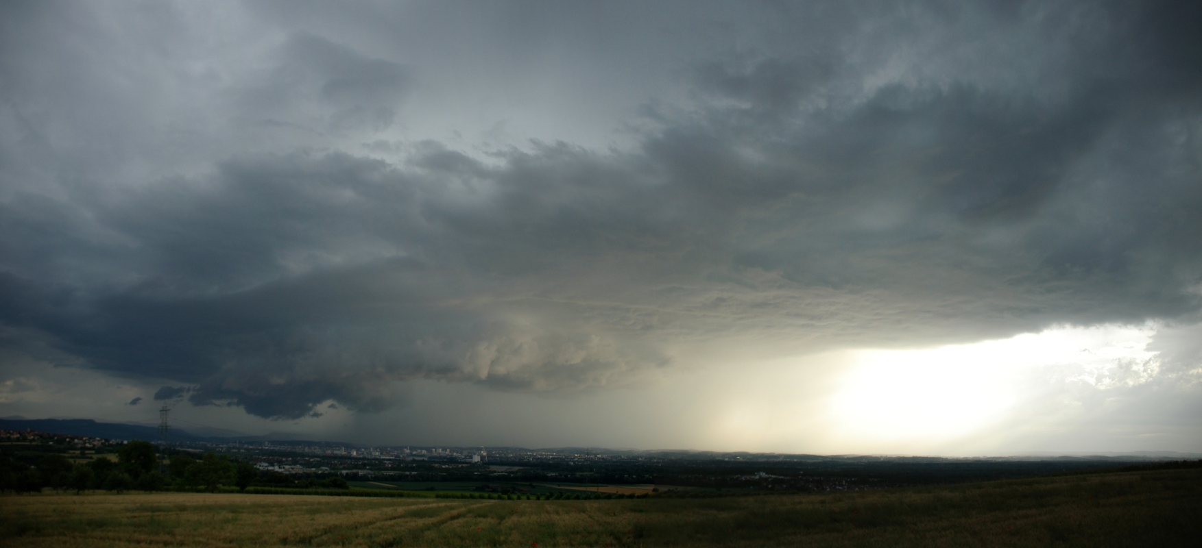 Ab jetzt ein paar Panoramen der Szenerie, die Zelle regnete sich über Basel ab und fusionierte augenscheinlich mit einer weiteren Zelle vom Jura kommend (zumindest laut Radarloop). Davor fand ich die Struktur der Zelle für die Wetterlage sehr gut organisiert, nein hatte gar eine Superzelle im Hinterkopf. :unschuldig: