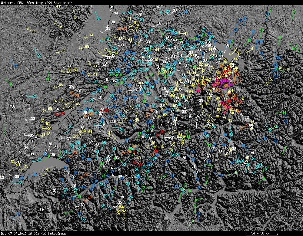 der Joran ist da (s. auch Meldungvom Beni)...zugleich immer noch outflow von den Alpengewittern (Chur 1010, Konstanz 1007 hPa)