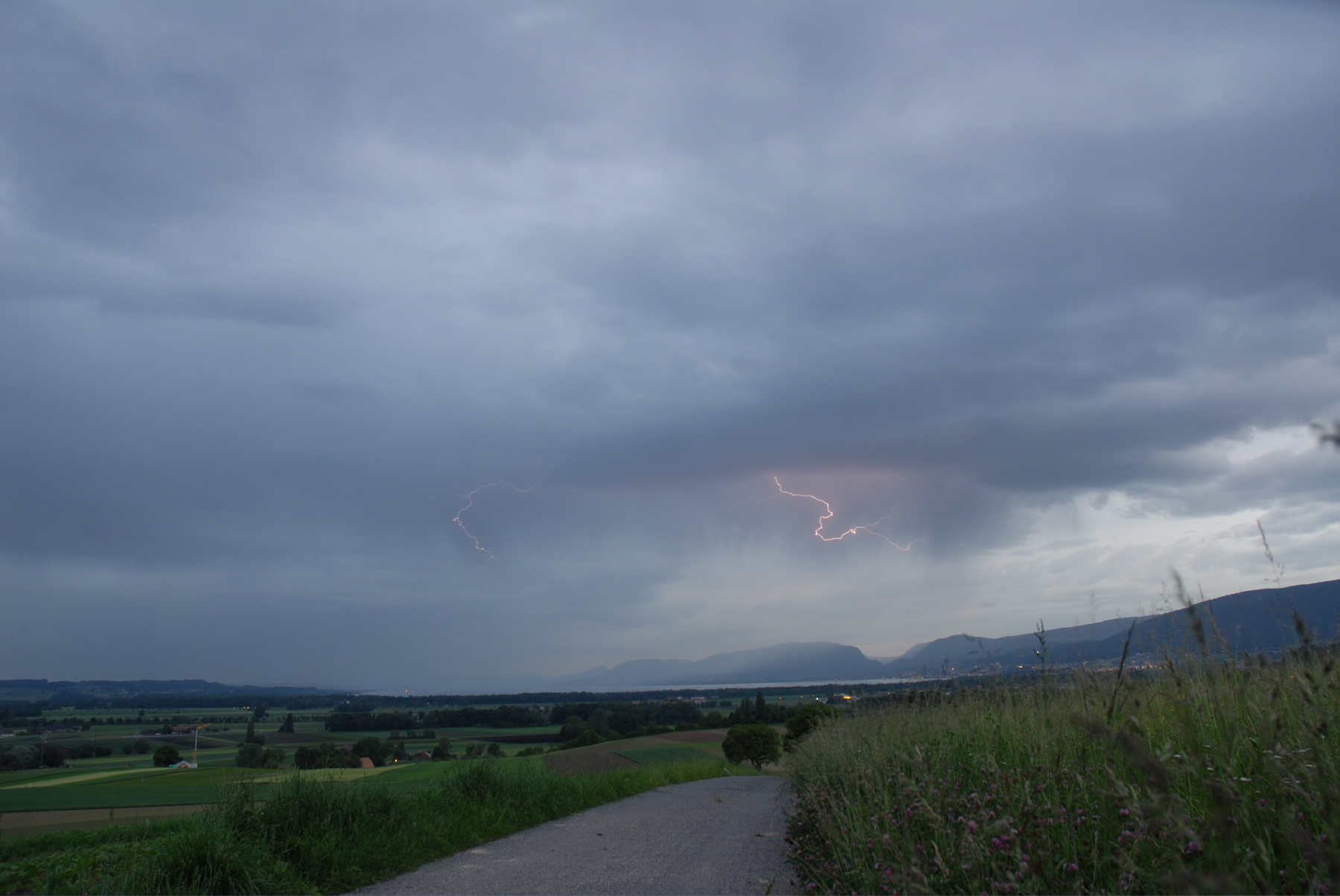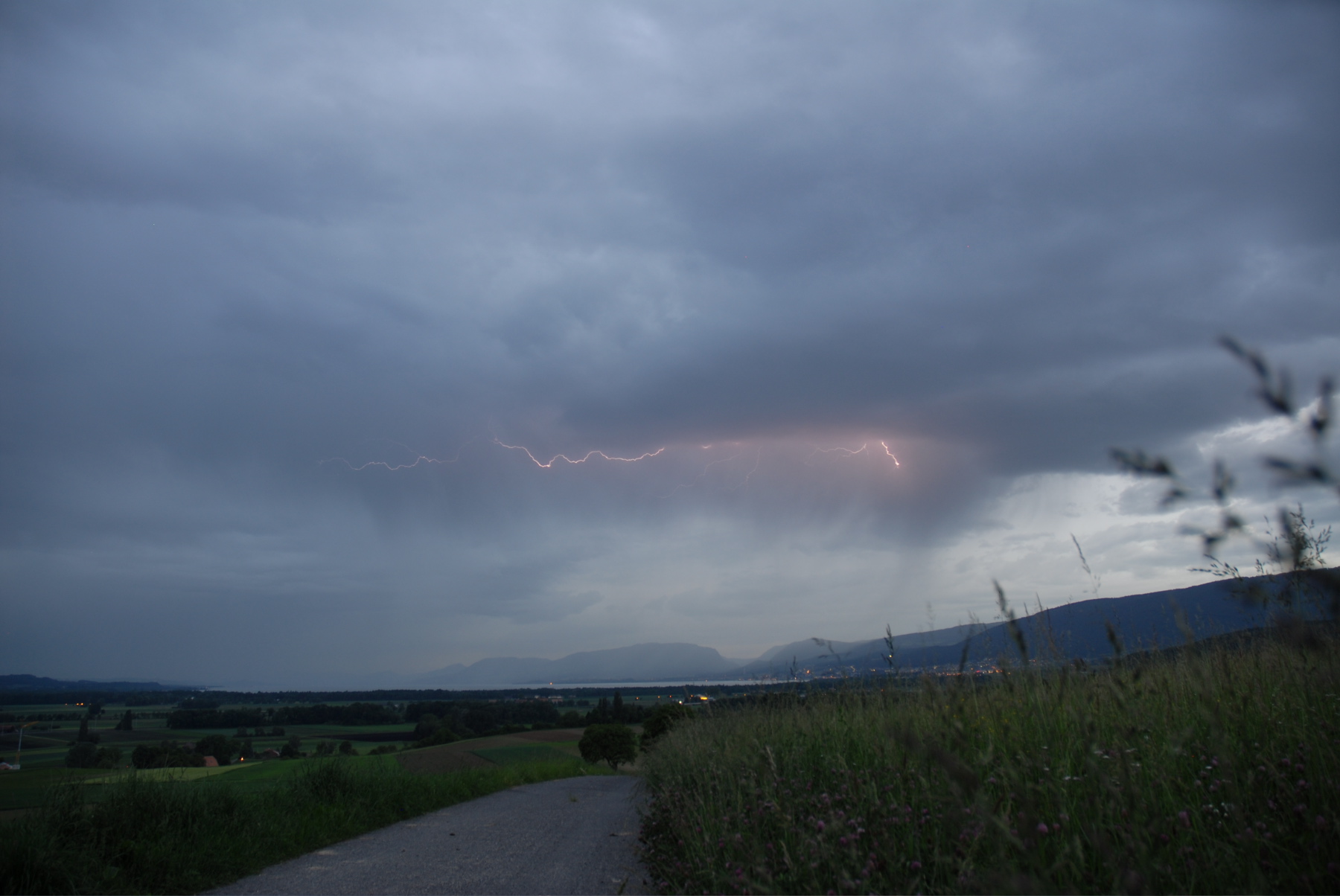 Heute war es in bodennahen Schichten definitiv zu trocken, so dass nichts Anständiges entstehen konnte. Für ein Minigewitterchen hat es doch noch gereicht. Vom St. Jodel in Ins sah man diverse Fallstreifen und ein paar Blitze.