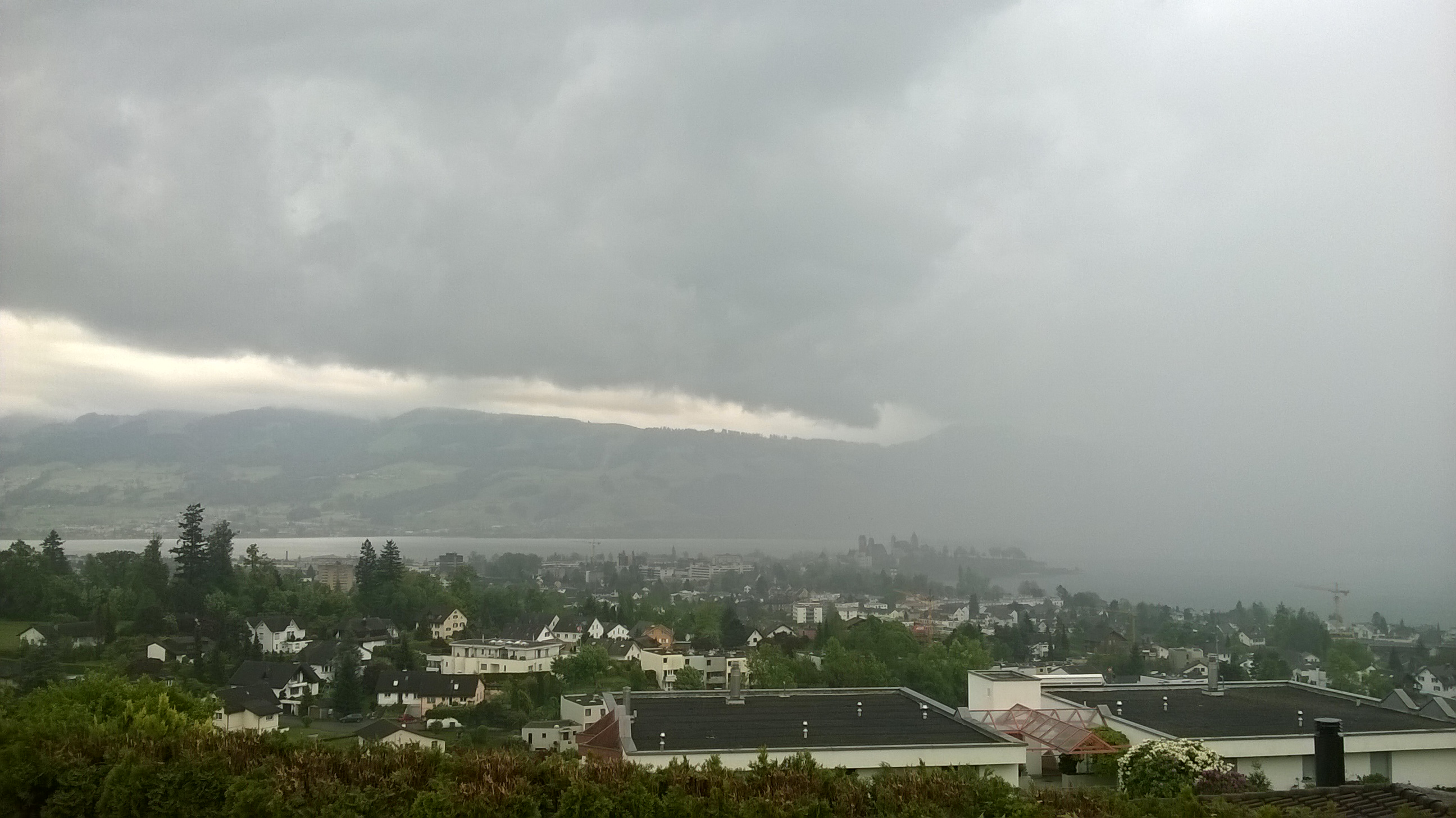 Ich wollte nicht den sleben Fehler begehen wie am 21.07.2012, als ich mich nach dem Zellsplit im Limmattal auf den nördlichen Teil konzentrierte, während der südliche Teil, den ich zuerst noch in den Fokus meines Chasings stellte, eine wunderschöne Wasserhose produzierte. Dieses Mal positionierte ich mich früh genug im Tiefenbrunnen - und es hat wirklich nicht viel gefehlt !