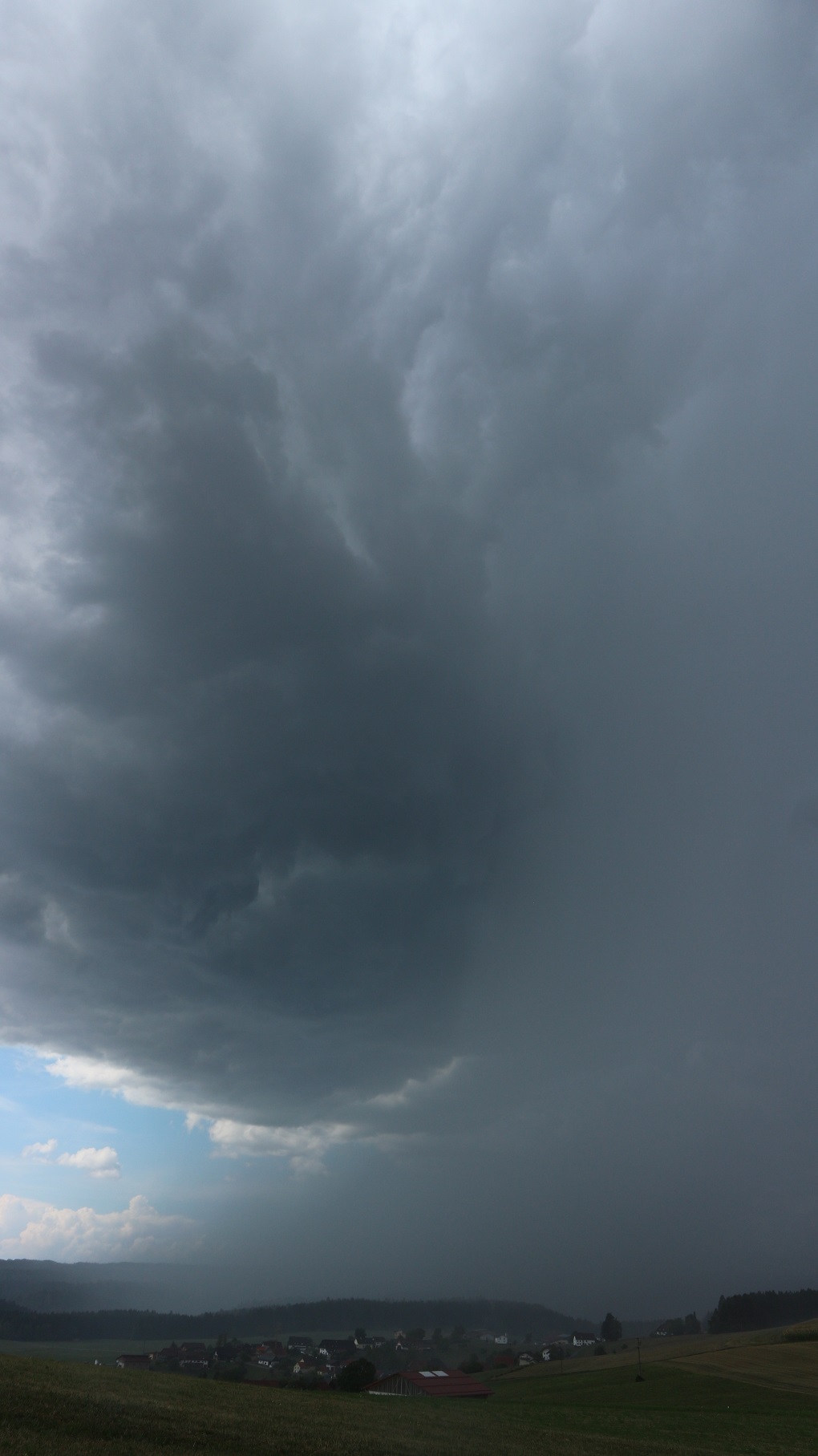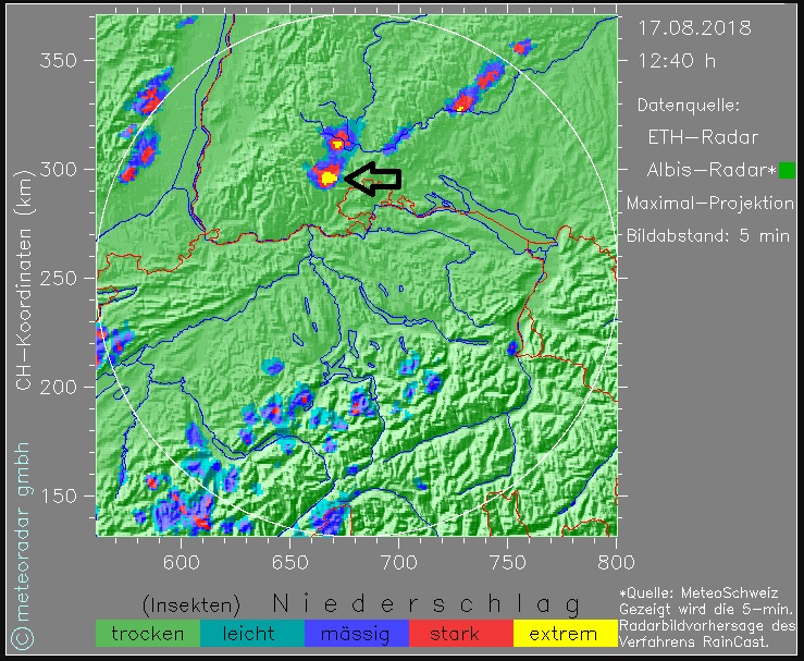 Im Lee des Randen quasistationäre leicht retrograde Gewitterzelle, die zuweilen etwas V-shapig daher kommt. Triggerlinie des V-Points ostwärts in Richtung Ravensburg - wenn durch den Bodensee noch etwas angefeuchtet, könnte er in SO-Richtung (V-Point) zum Ufer (Meersburg) wandern.... Cosmo hat erst heute Abend 'was drin...