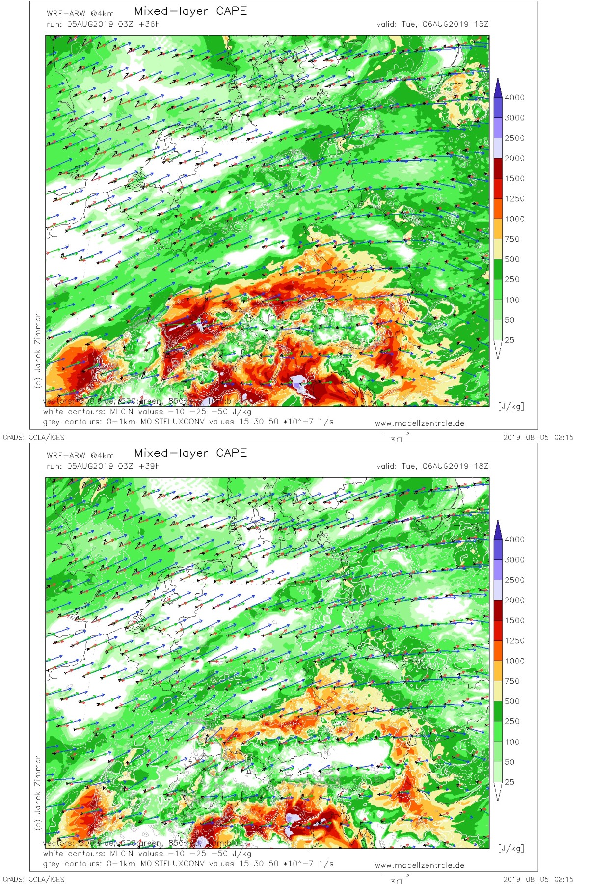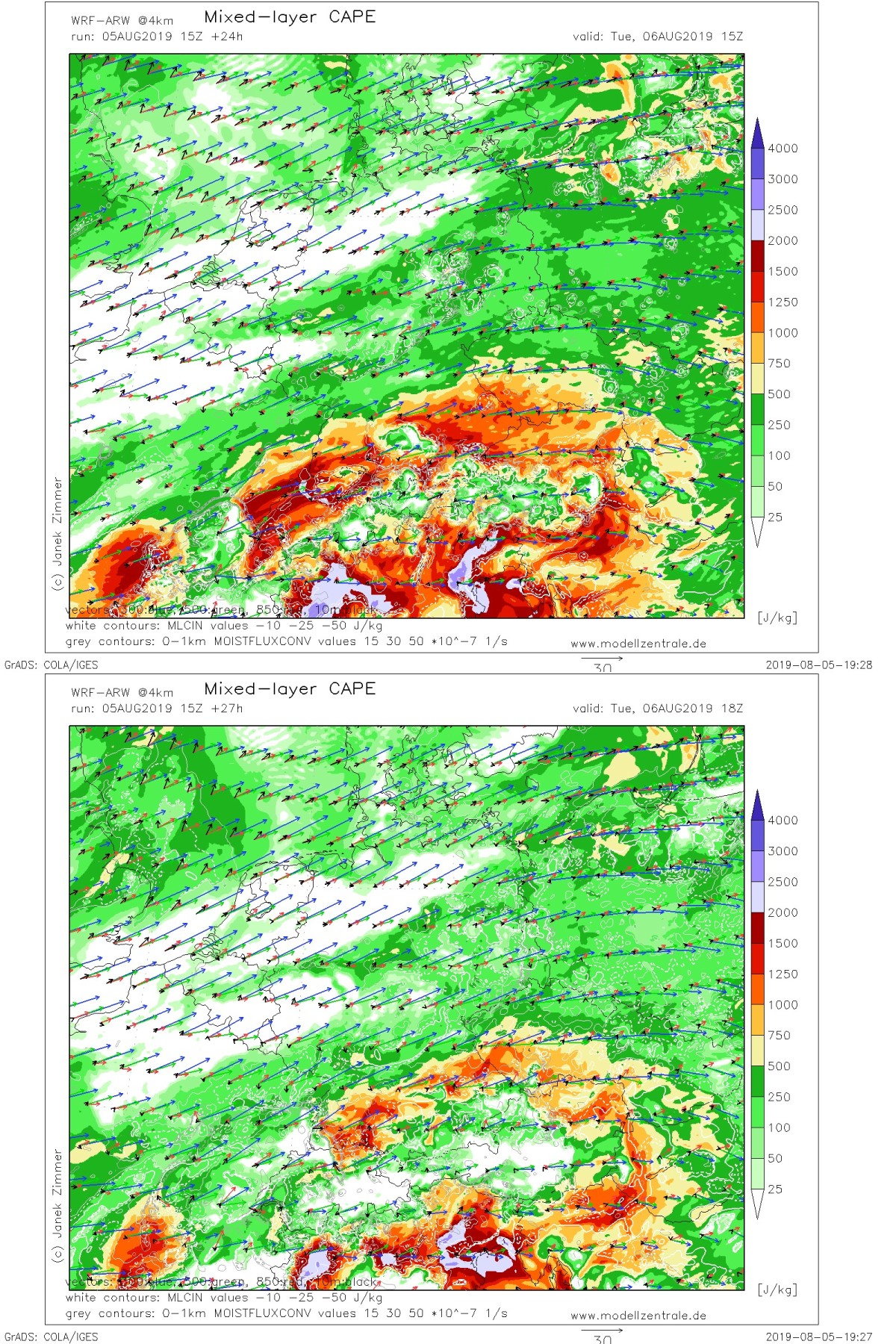 Die Temperaturen steigen bis am frühen Nachmittag - sollte die Sonne nicht verdeckt werden - auf verbreitet 27°-30° an. Die Taupunkte lägen bei ausreichenden 17-19°. Das niederschlagbare Wasser liegt bei etwa 35mm.