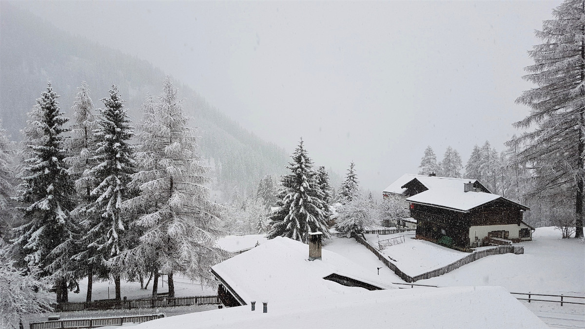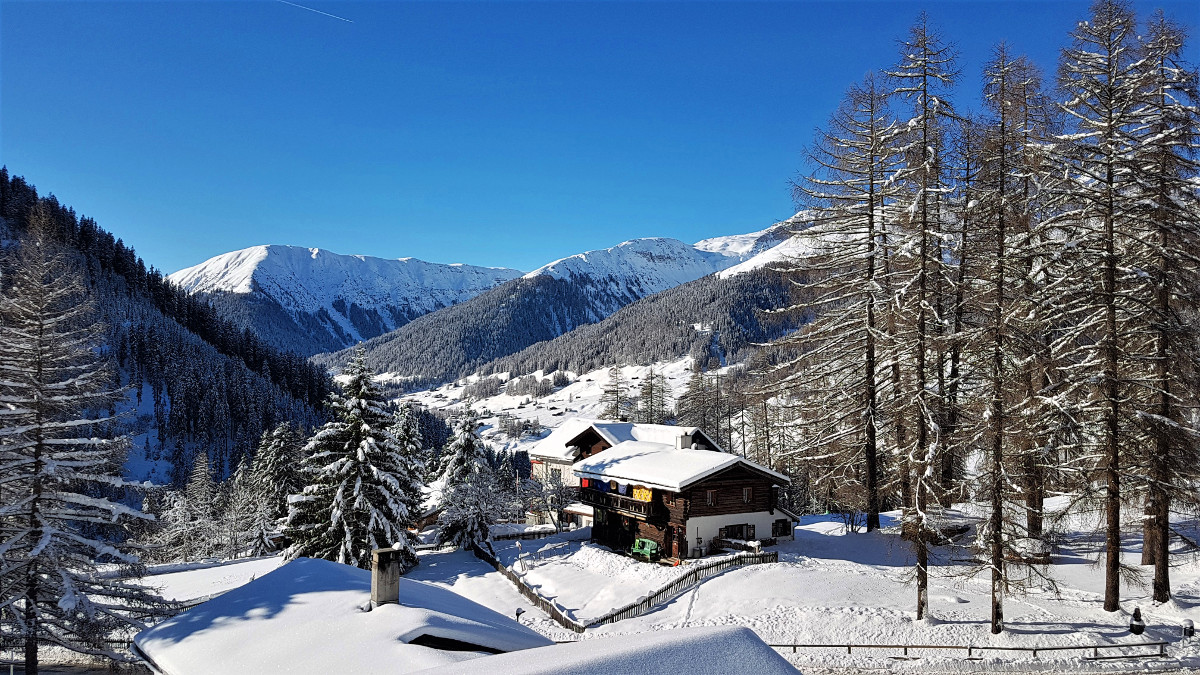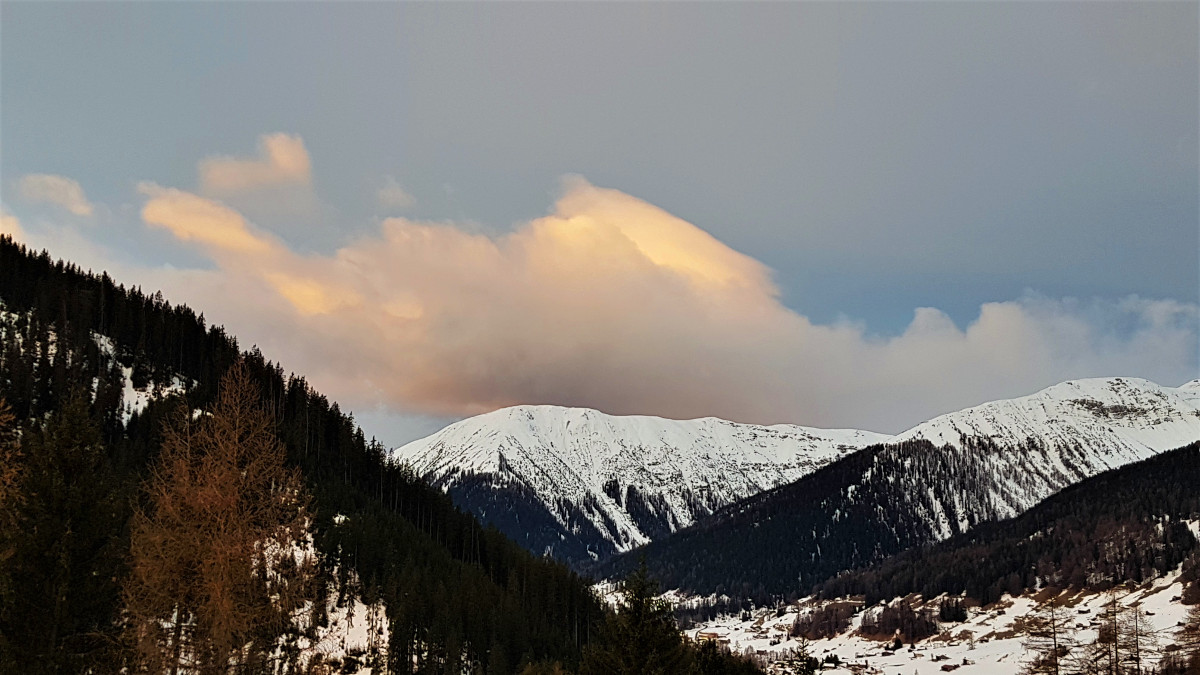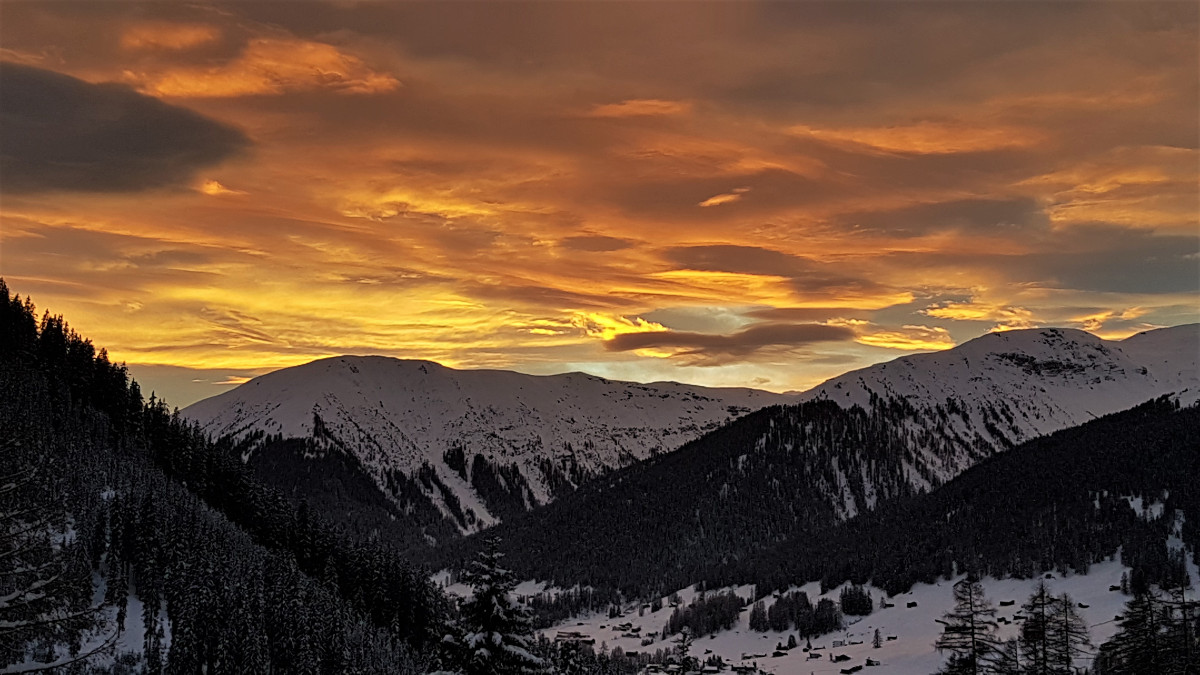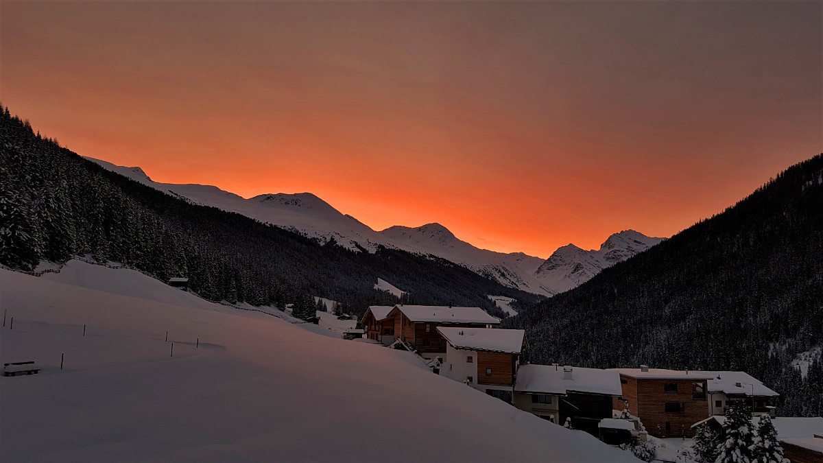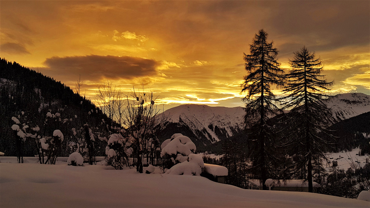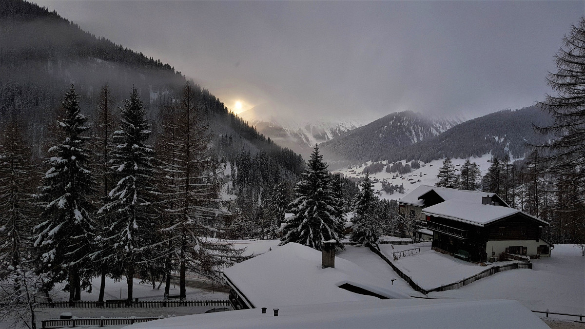 Die Chancen auf weisse Weihnachten standen gut und nach einigen Staffeln Schneefall vernahm ich, dass zwischen Klosters und Davos Schneeketten obligatorisch seien...… Verräterische Kratzgeräusche auf der Strasse gehörten zu den Schneeräumungsfahrzeugen, die alle 3 Stunden die Strassen befuhren. Erst am Heiligen Abend (24.12.2019) in der Früh verriet der rot gefärbte Morgenhimmel, dass zumindest an diesem Tag etwas Sonne zu erwarten war.....
