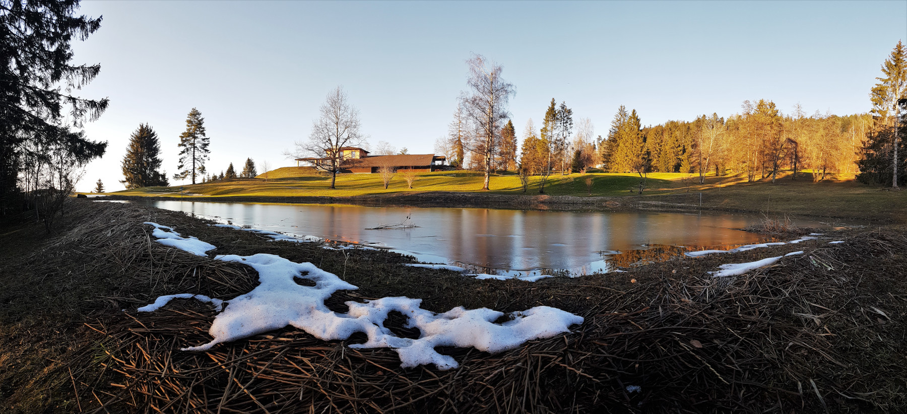Etwas oberhalb des Tümpels flutet die Frühlingssonne bereits die Wiesen des Golfplatzes....