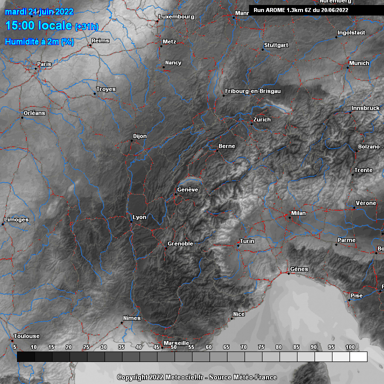 Ausgehend von einer Initial-Auslöse bei Lyon (F) soll ein sich nach Nordosten ausbreitender Schauer-/Gewittercluster entstehen und in der Folge für eine grossflächige Regeneration der bodennahen Luftfeuchte sorgen: