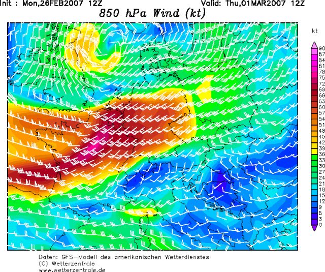 Entscheidend für wirklich hohe Windspitzen dürfte auch diesmal die Umwälzung der Luftmassen sein (Kaltfront). Im Gegensatz zu "Kyrill" (wellende Kaltfront über Deutschland) könnte die Schweiz diesmal von der Front erfasst werden; jedenfalls rechnet GFS einiges an Konvektion gegen Donnerstagabend. Damit wären die Voraussetzungen für eine ordentliche Durchmischung auf dem Papier vorhanden: