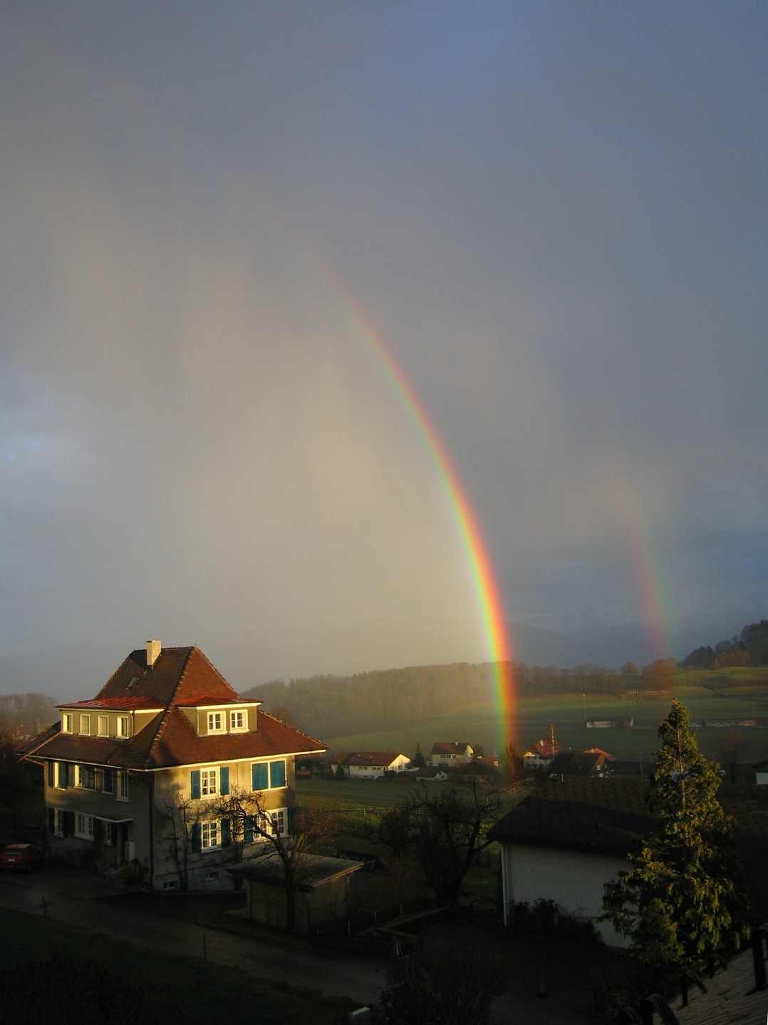 In Riggisberg gab es gestern zwar keinen Blitz und Donner (wie übrigens noch überhaupt nie in diesem Jahr), dafür aber ein intensiver Regenbogen nach einem Schauer um 18.00 Uhr: