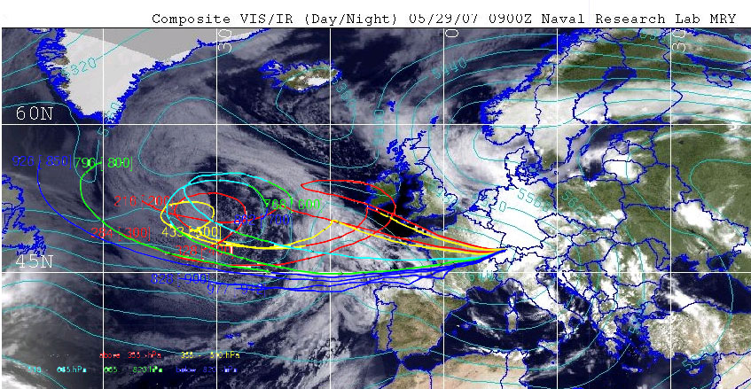 ECMWF sieht das, wie folgt (der Start der Trajektorien ist deinem Satellitenbild heute 09Z, mit