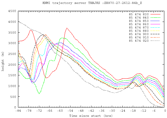 27. November. Ankunft in Zürich 47.4°N/8.5°E am 26. November 12 UTC, auf den Höhen über Grund (Zürich bei 0), 84 Std. retour).