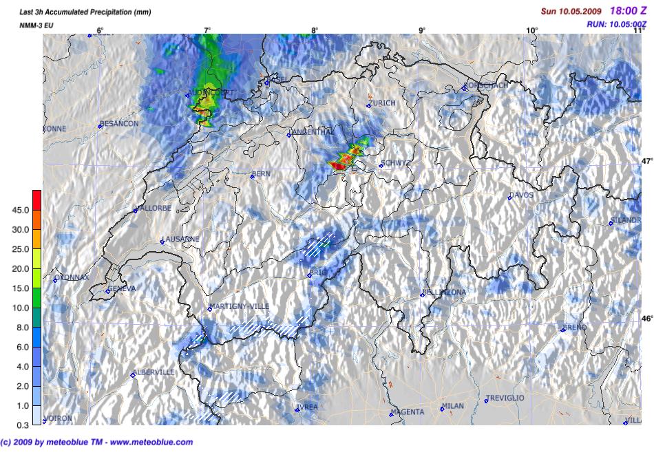 Nach den meisten Modellen (icl. DWD-LM via skyview/PC-Met) init. convection nach dem Mittag wieder zwischen Unterwallis/Saanenland, später Jura/Schwarzwald... abds. wandert das wieder nach Nordosten ins Mittelland.