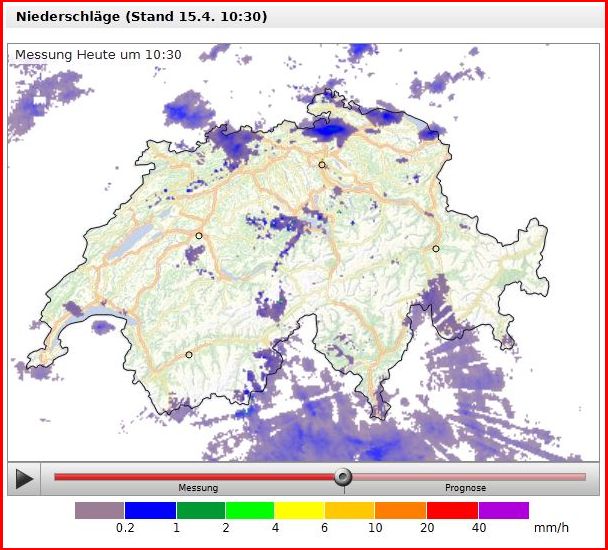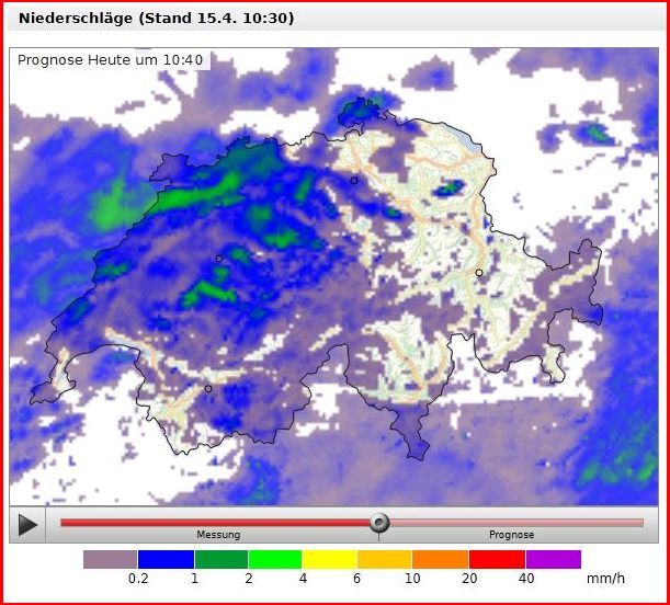 Ab 0.2mm/h wird eigentlich schon angezeigt, siehe: http://www.meteoschweiz.admin.ch/web/de ... rbild.htmlStefan im Kandertal hat geschrieben:Ausserhalb der Echos kommt mit <0,2 bis 0,8mm die Stunde aber auch schlicht zu wenig runter damits angezeigt würde?