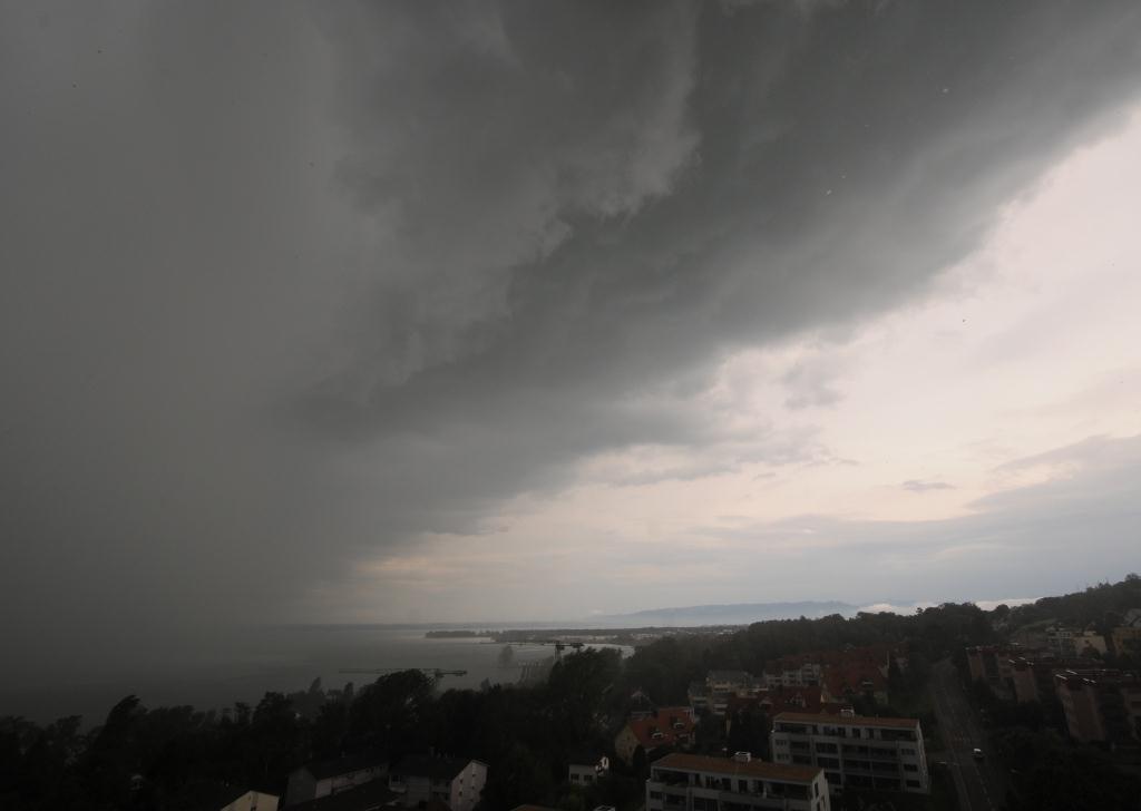 Um 14 Uhr sehr schöner Kaltfrontdurchgang über dem Bodenseegebiet mit starken Böen, Schauern und ausgeprägten Wolkenstrukturen.