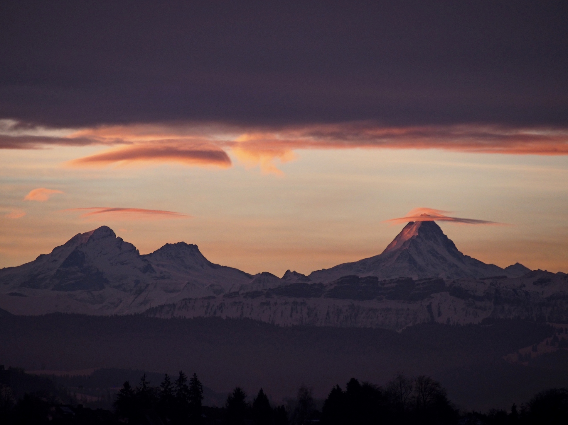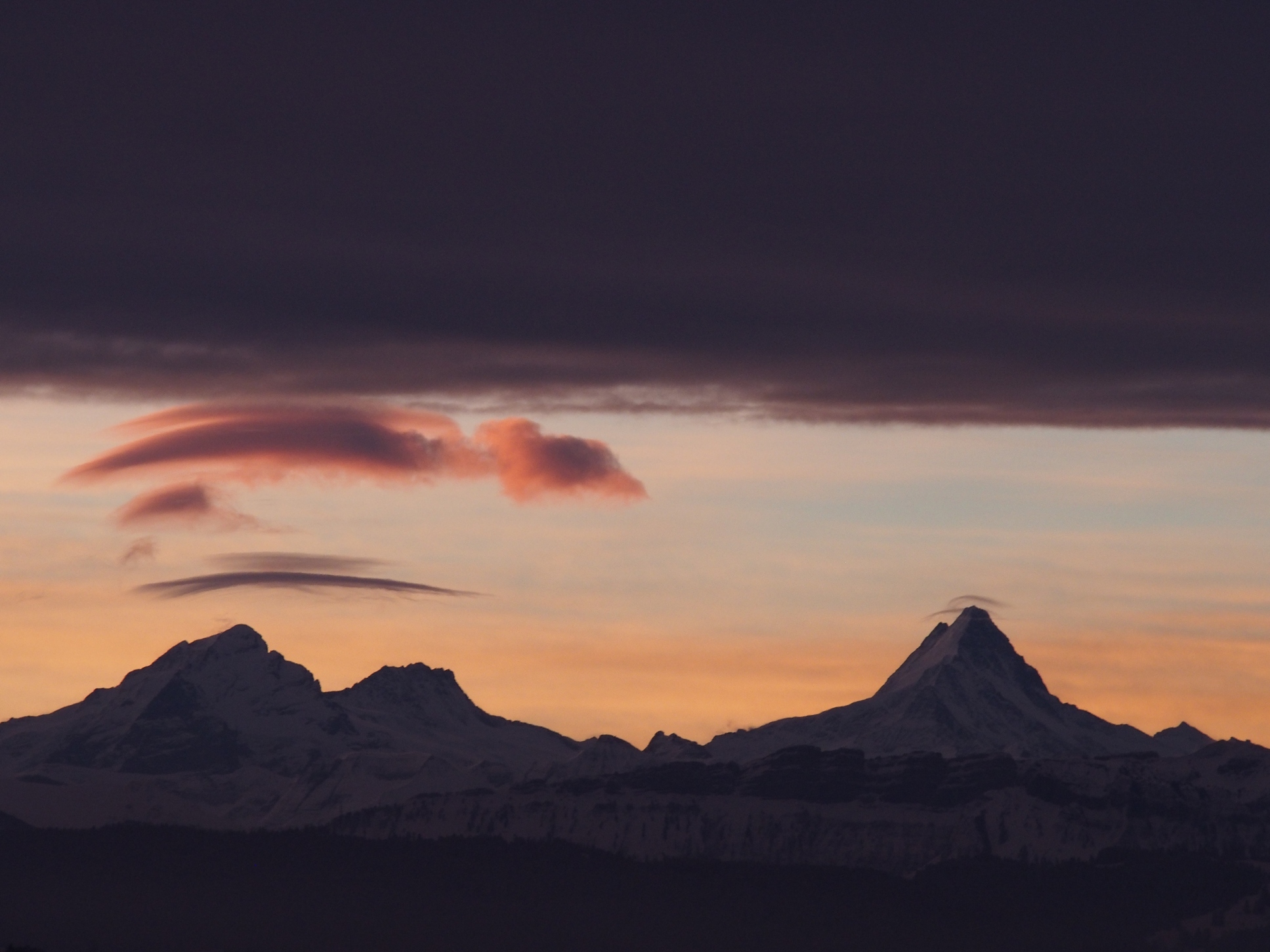 Im Vorfeld der Wolkenfront bilden sich über Wetter- (3692m) und Schreckhorn (4078m) AC lenticularis: