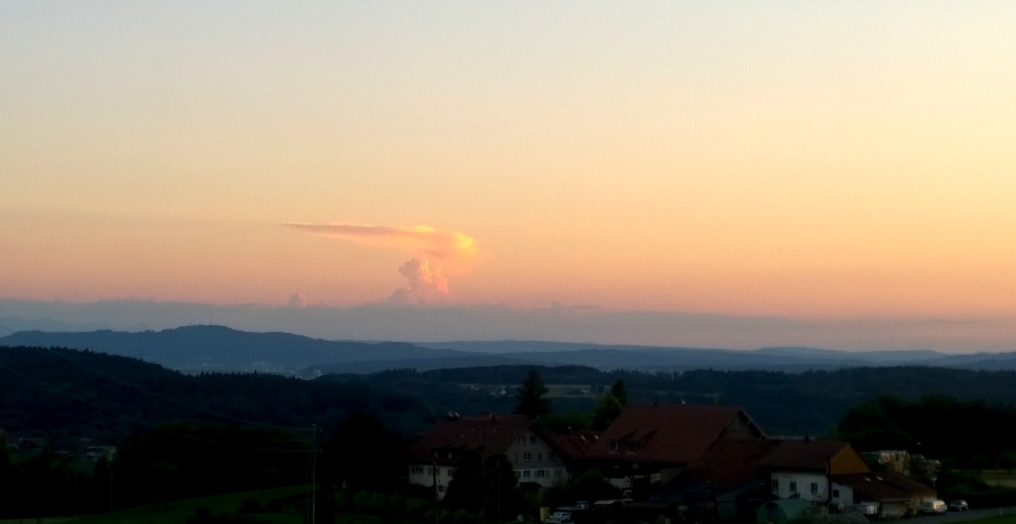Auf meiner Abendspaziergangroute auf dem Sonnenbühl (mein Hausberg) war ich schon etwas verdutzt, als ich diese Kapriole der Natur sah und auf diese Distanz nicht einschätzen konnte, wo das Pfüpfli hochging. Bei sehr guter Föhnlage und entsprechender Fernsicht sieht man sogar bis in die Walliser-Alpen :shock: ; dann wirkt der Üetliberg bei Zürich, als sei er einen Steinwurf entfernt. Hier thront er im normalen Abenddunst (links im Bild), mit dem Fernsehturm gekrönt. Und am Horizont, in rd. 162 km Entfernung, brandet eine feuchtwarme, vorlaufende "Welle" an die Alpen und wird orografisch begünstigt in die Höhe gezwungen (Foto von 20 08 Uhr MESZ):
