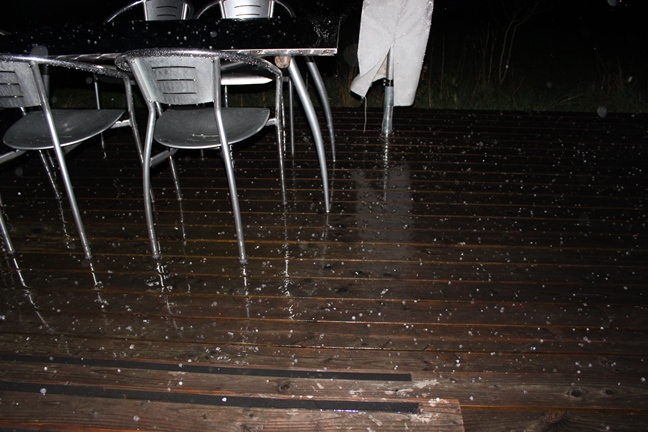 Kurze Zeit später fiel kräftiger Regen ein, und ab und zu dachte ich, ich hörte sogar ein Hagelkörnchen auf den Esstisch prasseln. Nach erster Enttäuschung über die geringe Grösse (eher Graupel zu dem Zeitpunkt) und damit die Unmöglichkeit, einen Drink zu kühlen, wurde der Schallpegel plötzlich immer lauter, und siehe da: