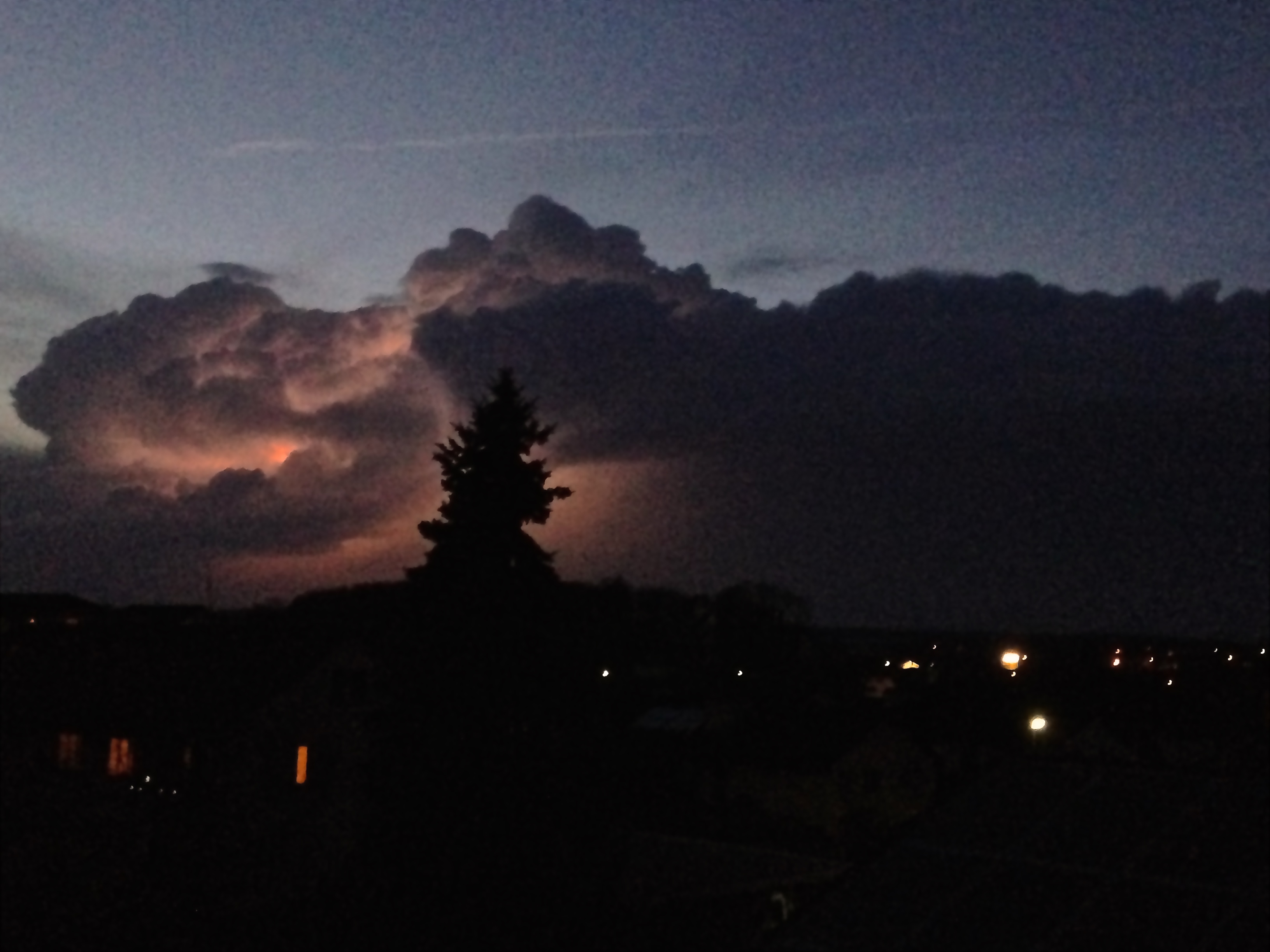 Meine Frau und ich sassen gemütlich auf der Terrasse und staunten ob der konvektiven Entwicklungen kurz vor Sonnenuntergang, und ob der etwas kuriosen Windverhältnisse und entsprechend ungewohnter Wolkenformationen, als der erste Blitz sich bemerkbar machte. Und der zweite folgte sogleich, und der dritte auch und und und ... in dem Moment war ich eigentlich schon glücklich, doch dann ging's erst richtig zur Sache :shock: